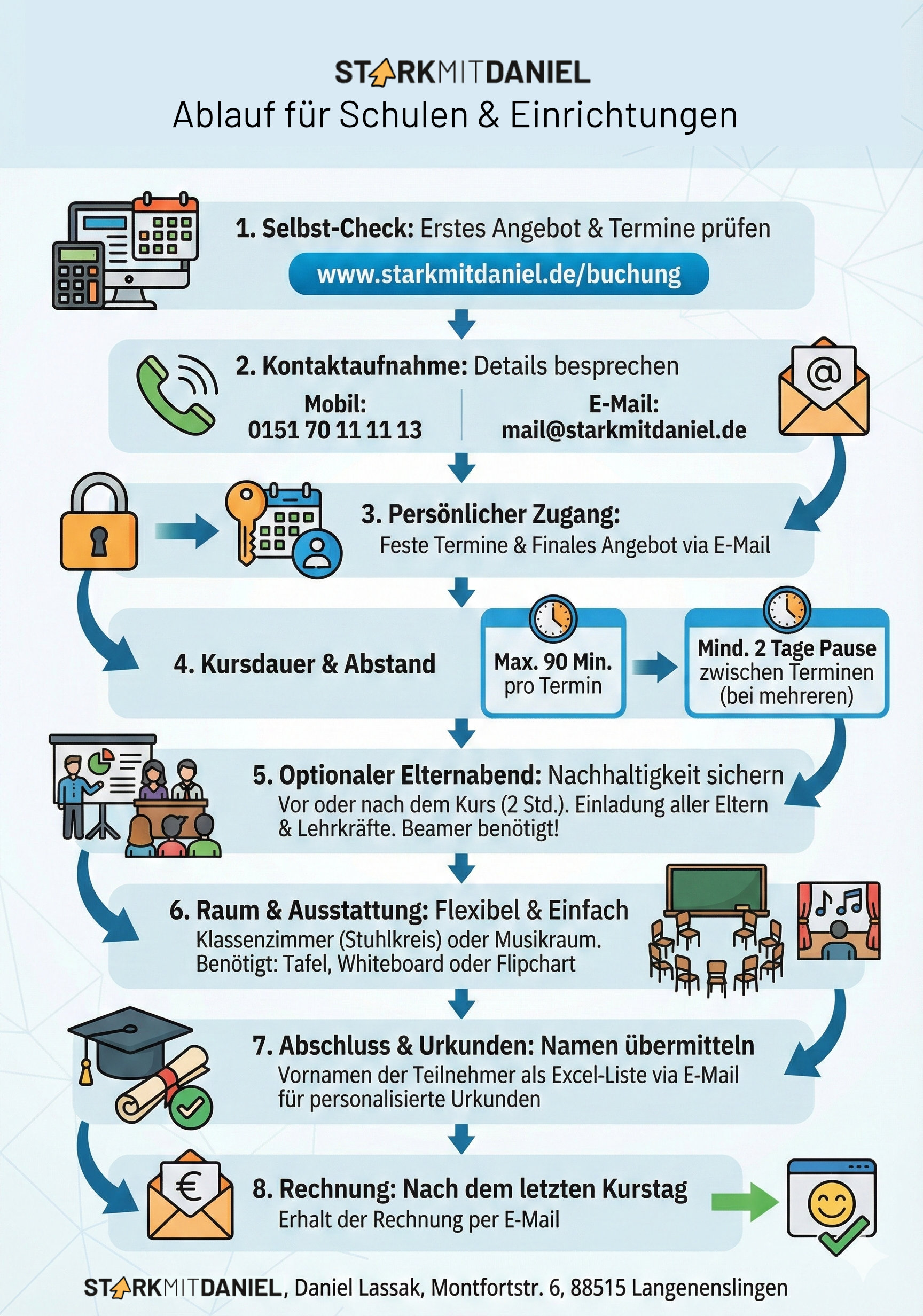 Ein Kurs wird individuell mit Ihnen zusammen an die Bedürfnisse Ihrer Kita, Kindergarten, Schule oder öffentlichen Veranstaltung angepasst.